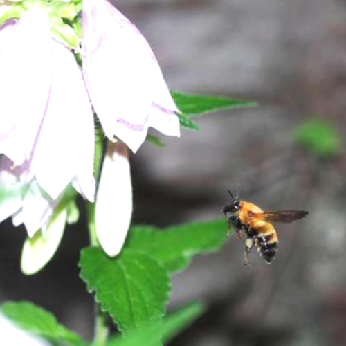 野川公園の自然観察園で、ホタルブクロの花に訪れるトラマルハナバチを観察した。